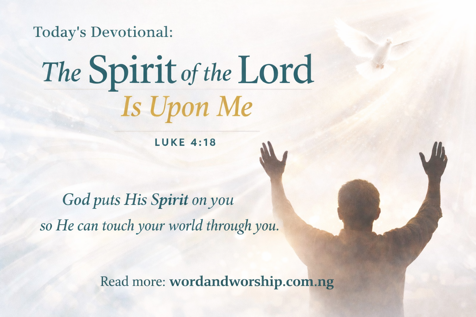 Lord, let my life reflect the reality of Your Spirit resting upon me. Help me to walk with courage, compassion, and clarity so that wherever I go, Your presence becomes visible through what I say and what I do. Amen.