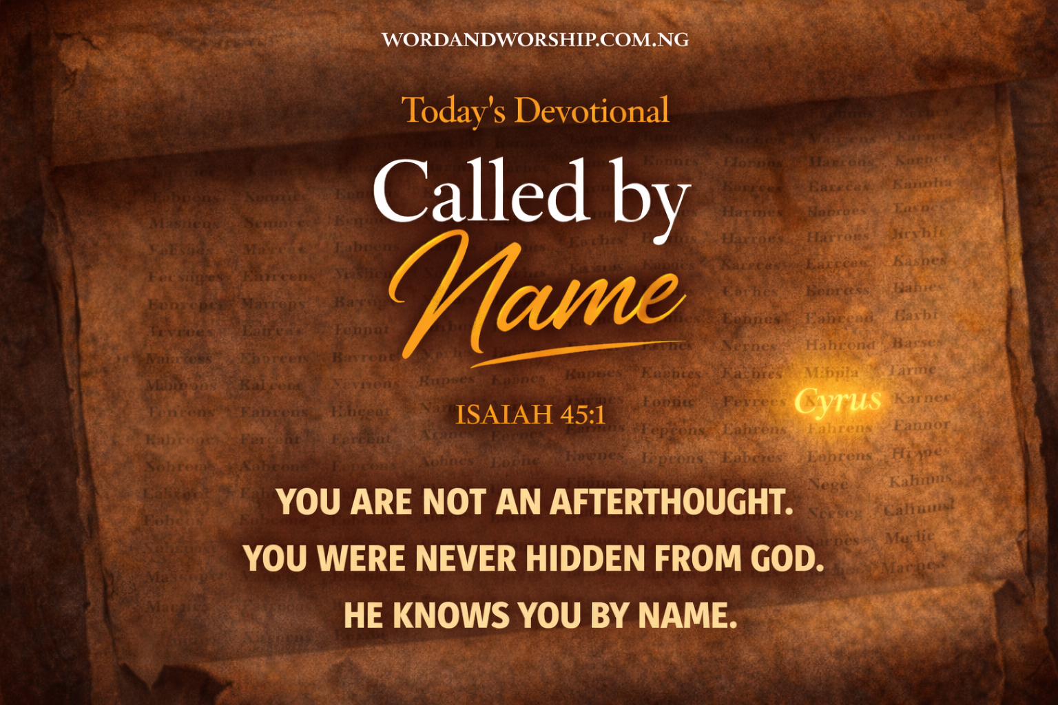 Cyrus was fully known in heaven. Before there was language for it on earth, before there was awareness of it in him, God had already named him. Many people are comfortable with the thought that God sees everyone. But being called by name comes much closer than that. It means your life stands before God in full view. You are not lost within the great mass of humanity, and you are known distinctly. God knows where His word belongs; He knows the life He is speaking into.